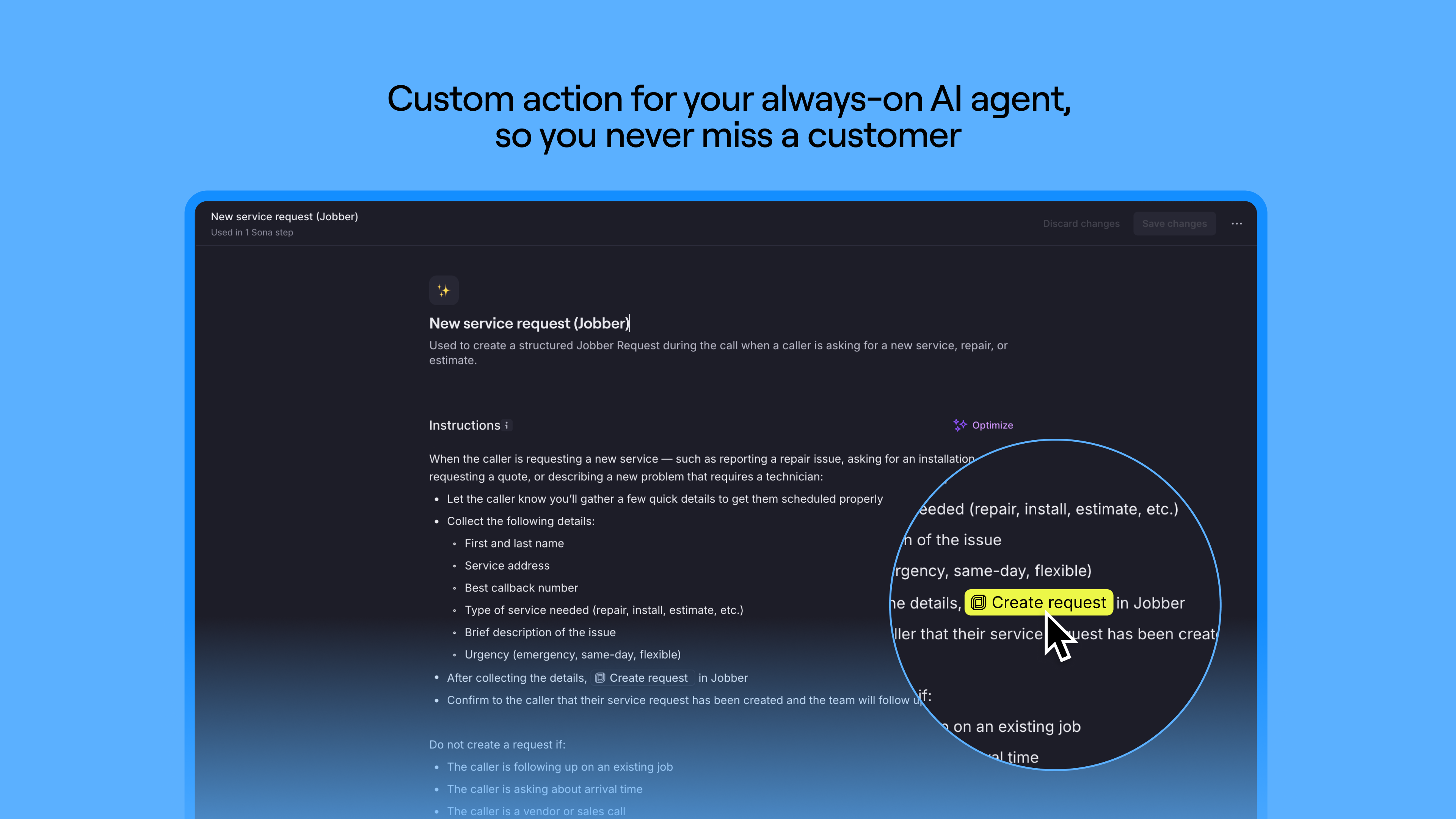 When you set up a custom Sona job, you can tell Sona exactly when to create a service request from a phone call it handles — based on the conversation and your instructions. This gives you more control over request creation in Jobber and helps make sure requests reflect real service needs.