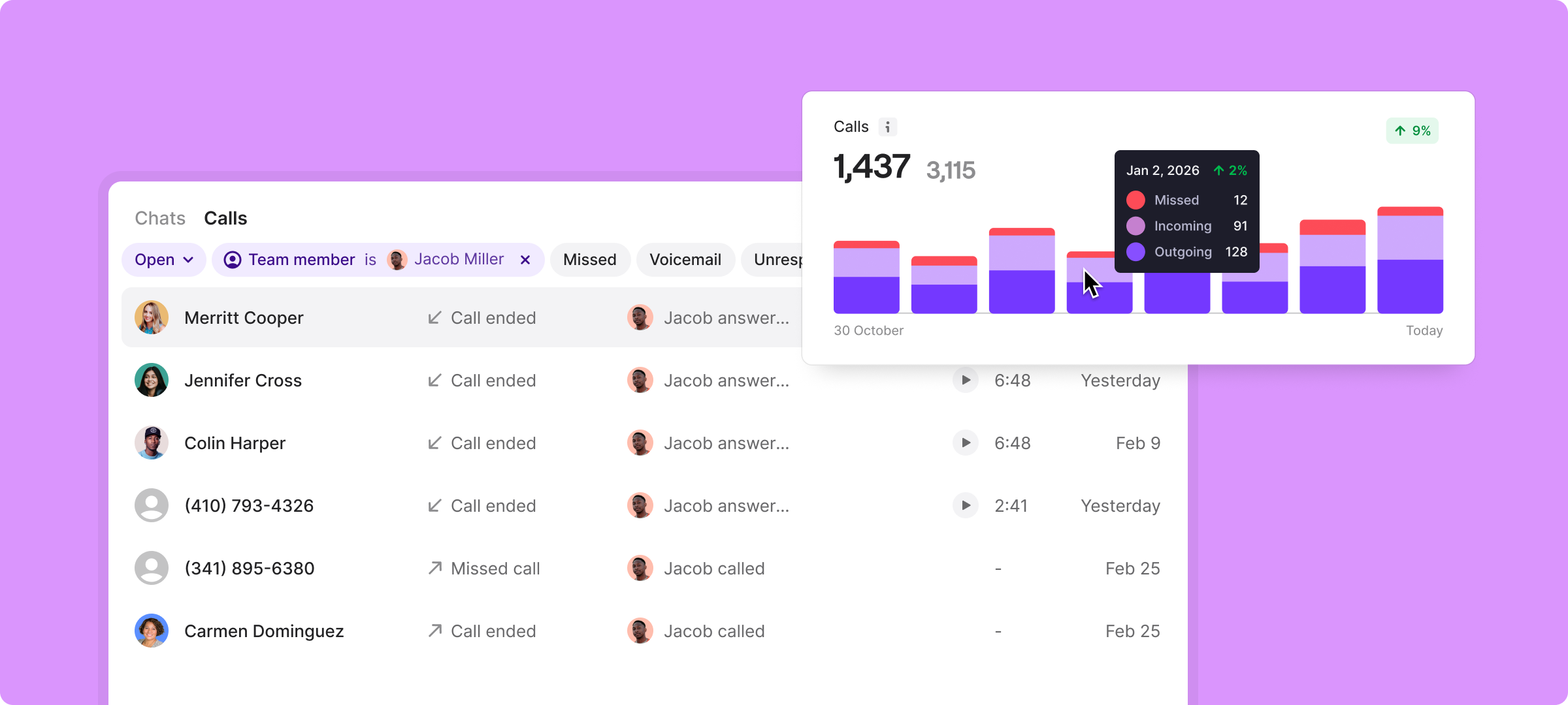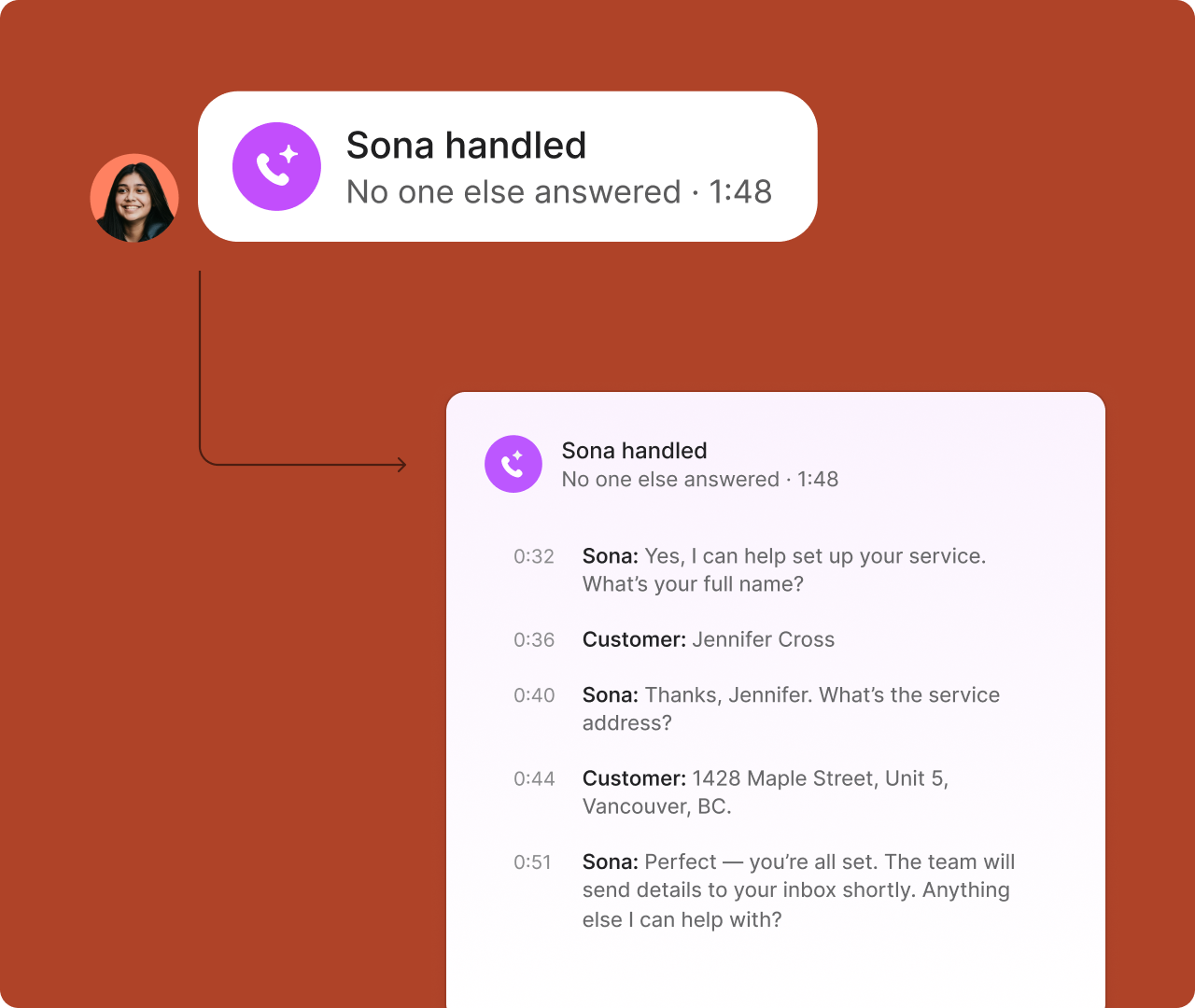 AI-generated call summaries and complete conversation history mean anyone can jump in with full context.