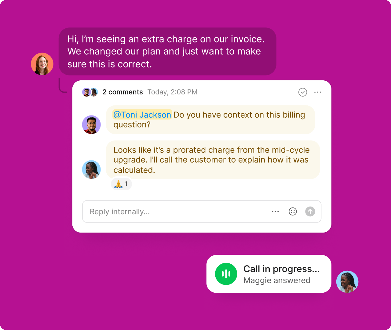 Use shared numbers and internal notes so teammates can coordinate behind the scenes and customers never have to re-explain the issue.